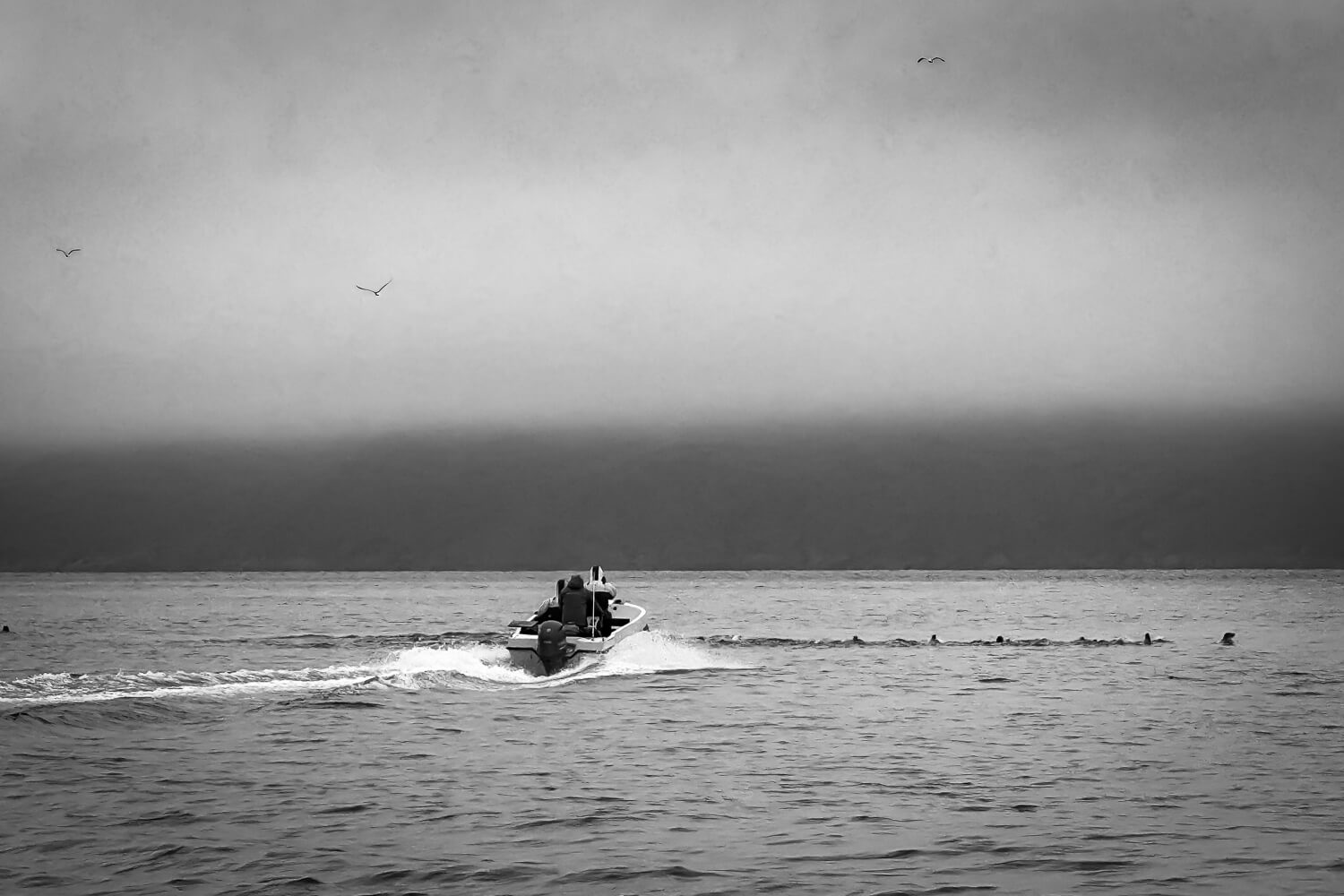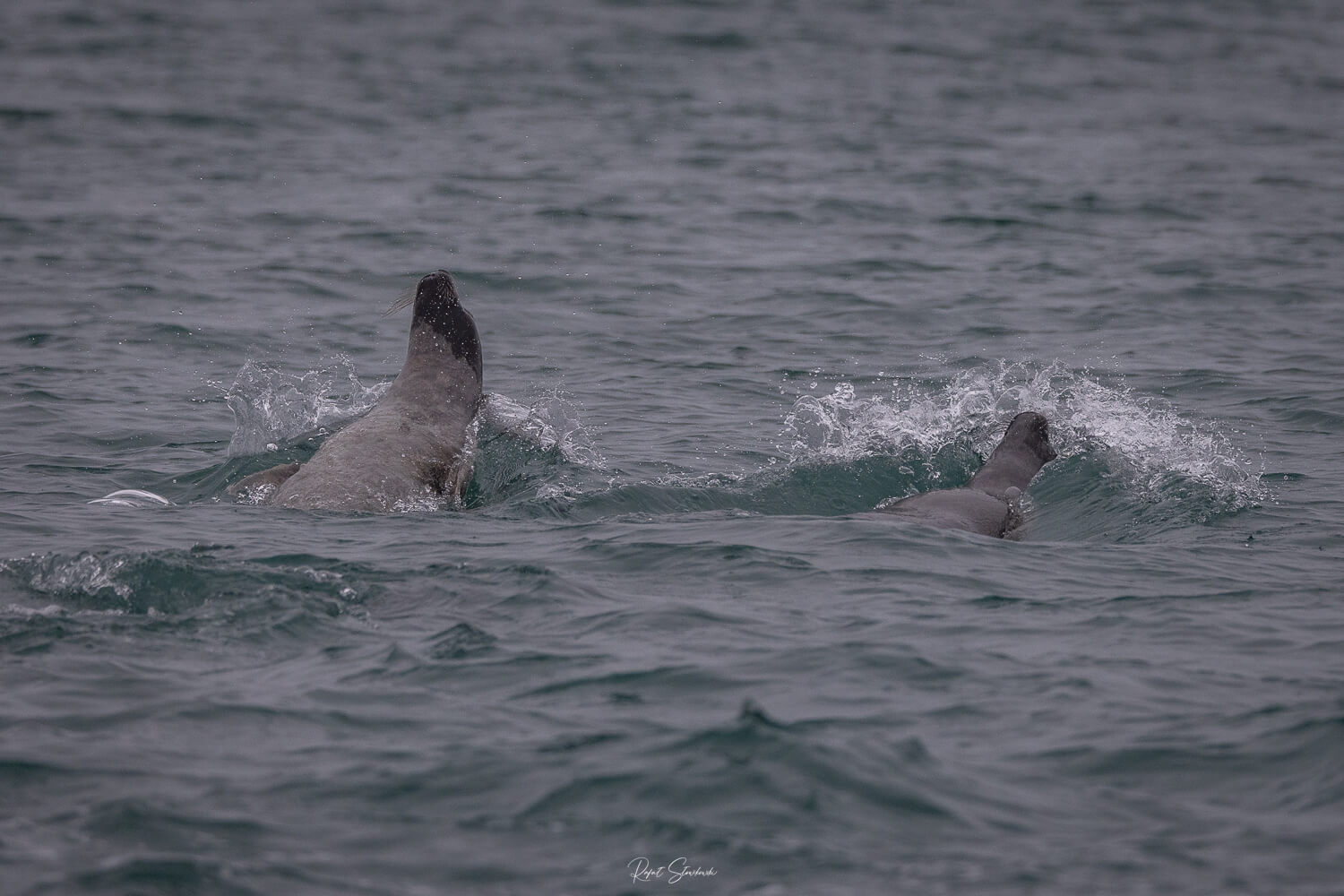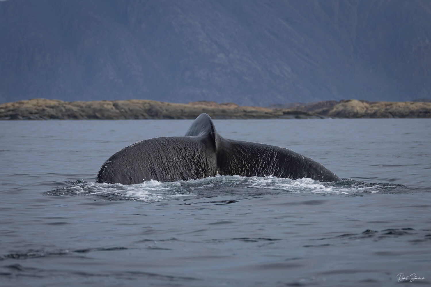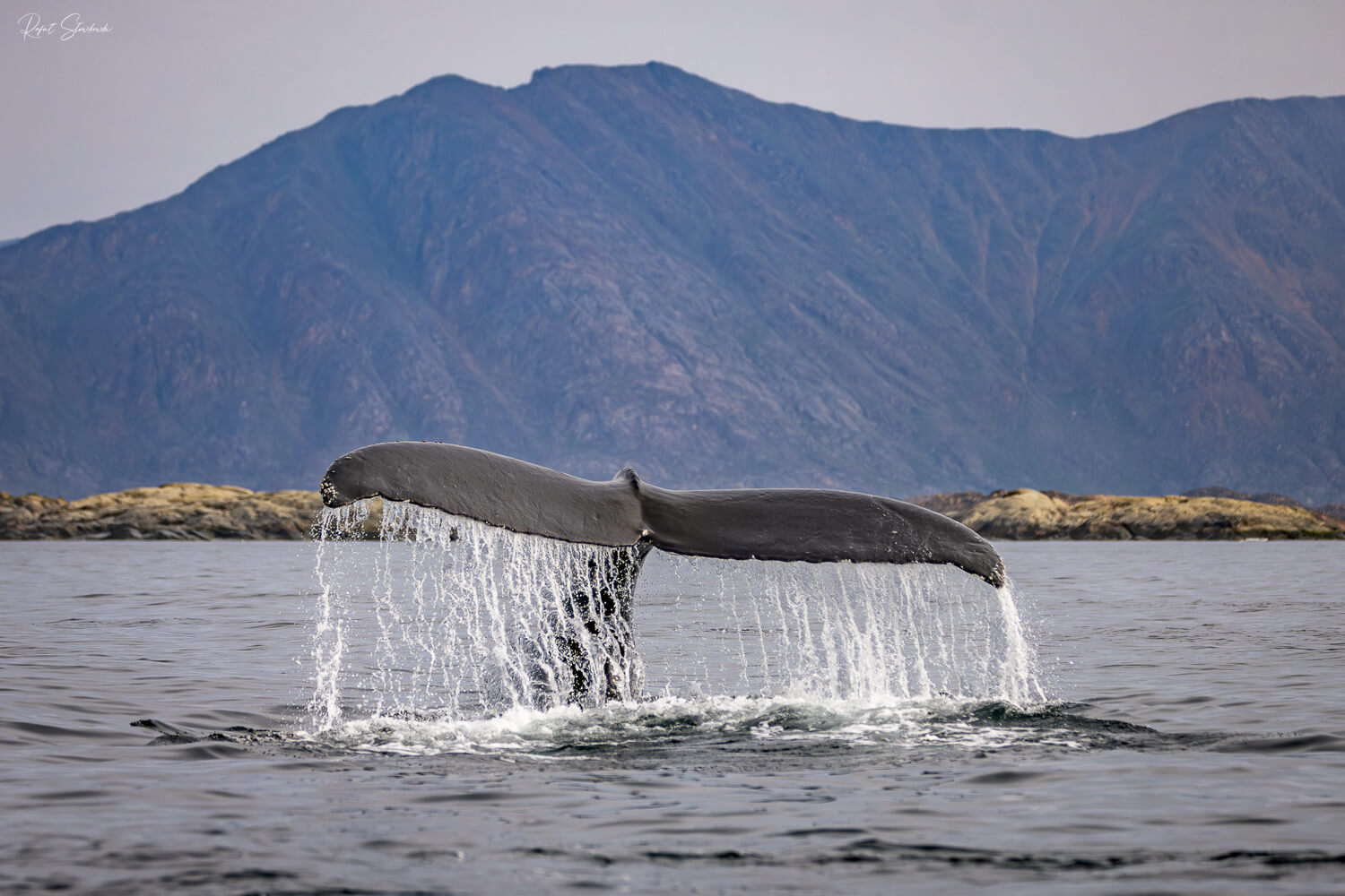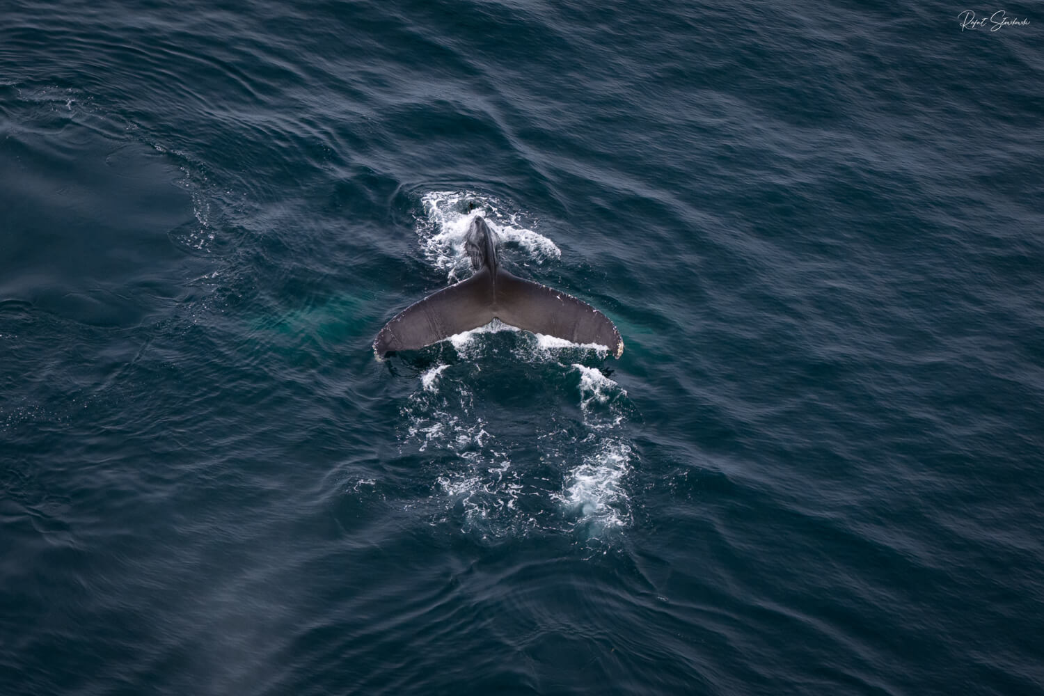 Ich oddechy w postaci charakterystycznych „pufnięć” było słychać co kilka sekund. Lepiej trafić nie mogliśmy! Gatunek ten słynie z z wydawania wyjątkowych pieśni, niskich złożonych dźwięków, słyszalnych na przestrzeni setek kilometrów, trwających około 10–25 minut. Hipotezy naukowe mówią szybciej o ustalaniu hierarchii między samcami niż zwracaniu uwagi samic (coś jak rykowisko u jeleni), udowodniono też, że niskie głośne dźwięki są często używane podczas polowania, służąc do dezorientowania ryb! A w humbakowym menu znaleźć się mogą m.in. czerniaki, dorsze i łososie, zatem palie pewnie też.
