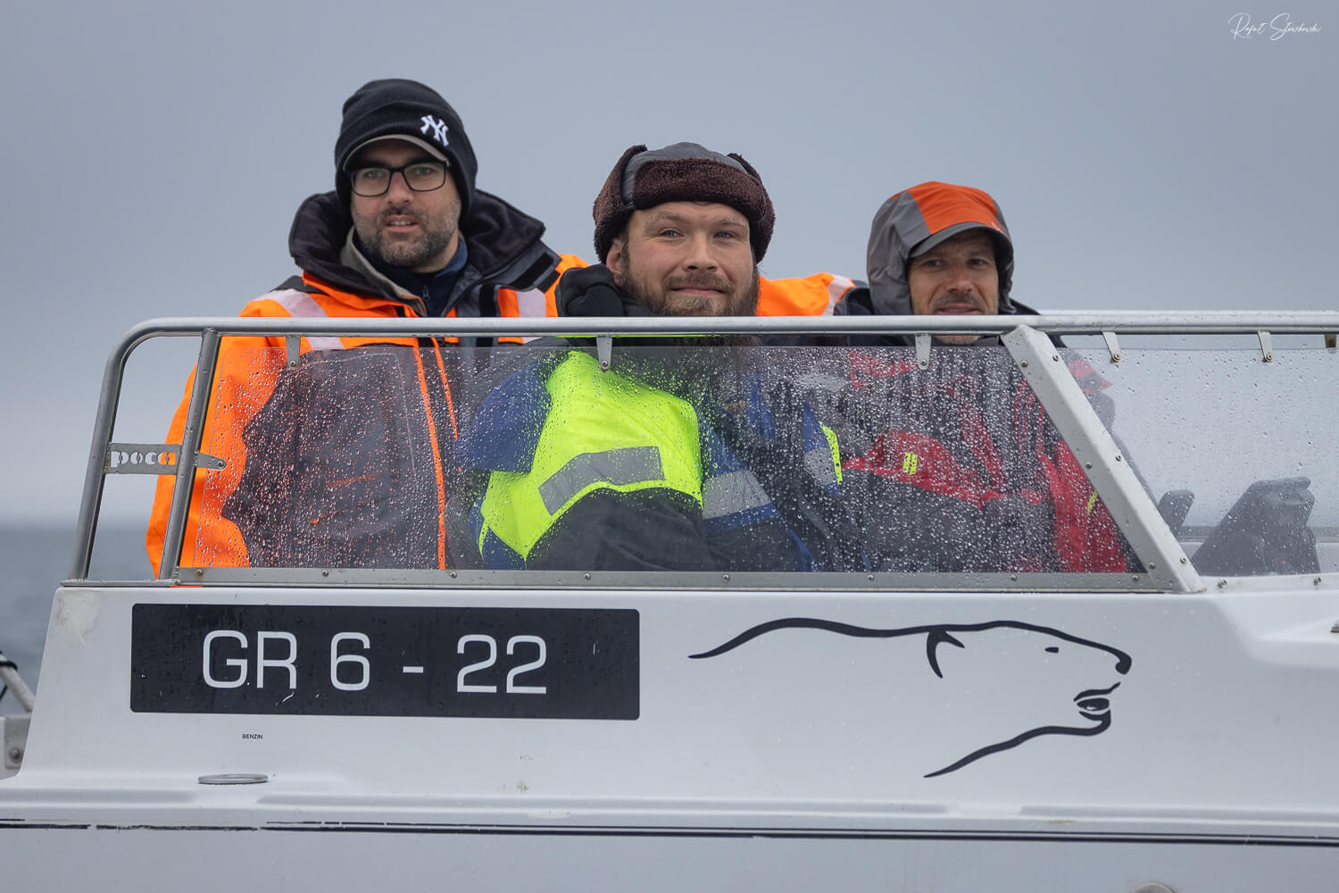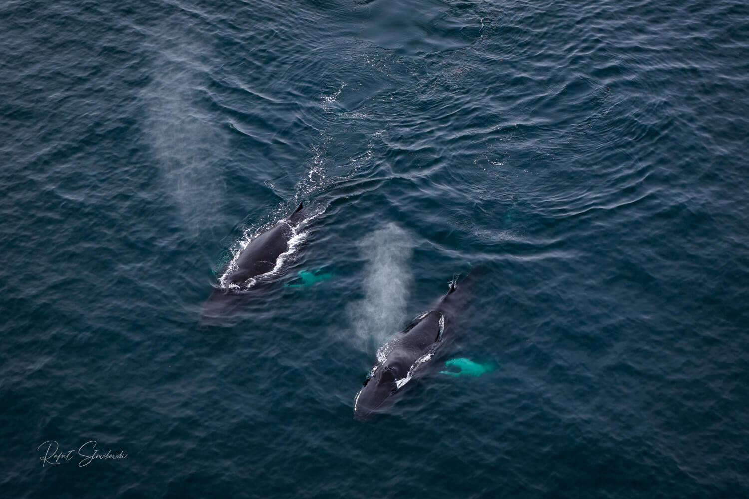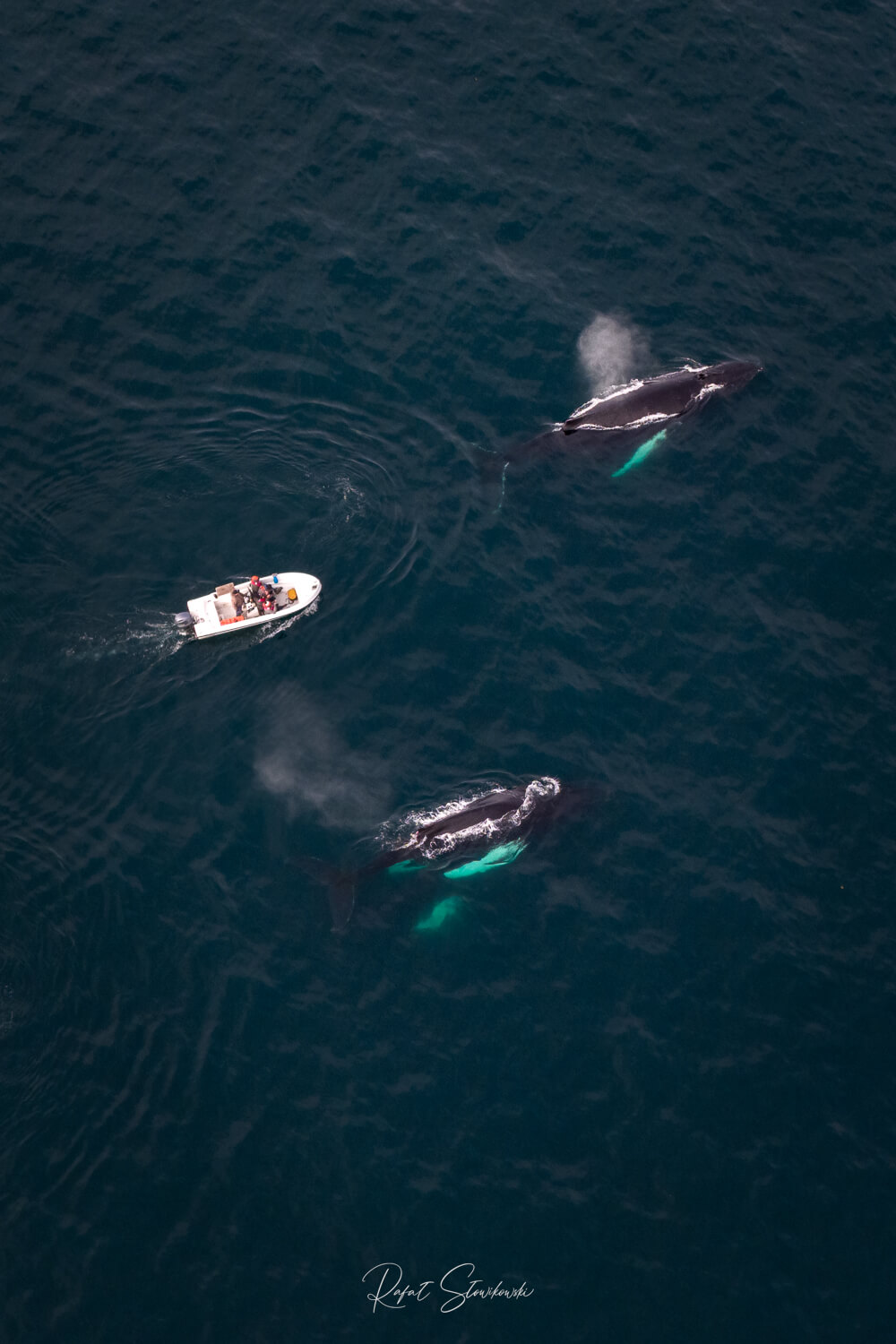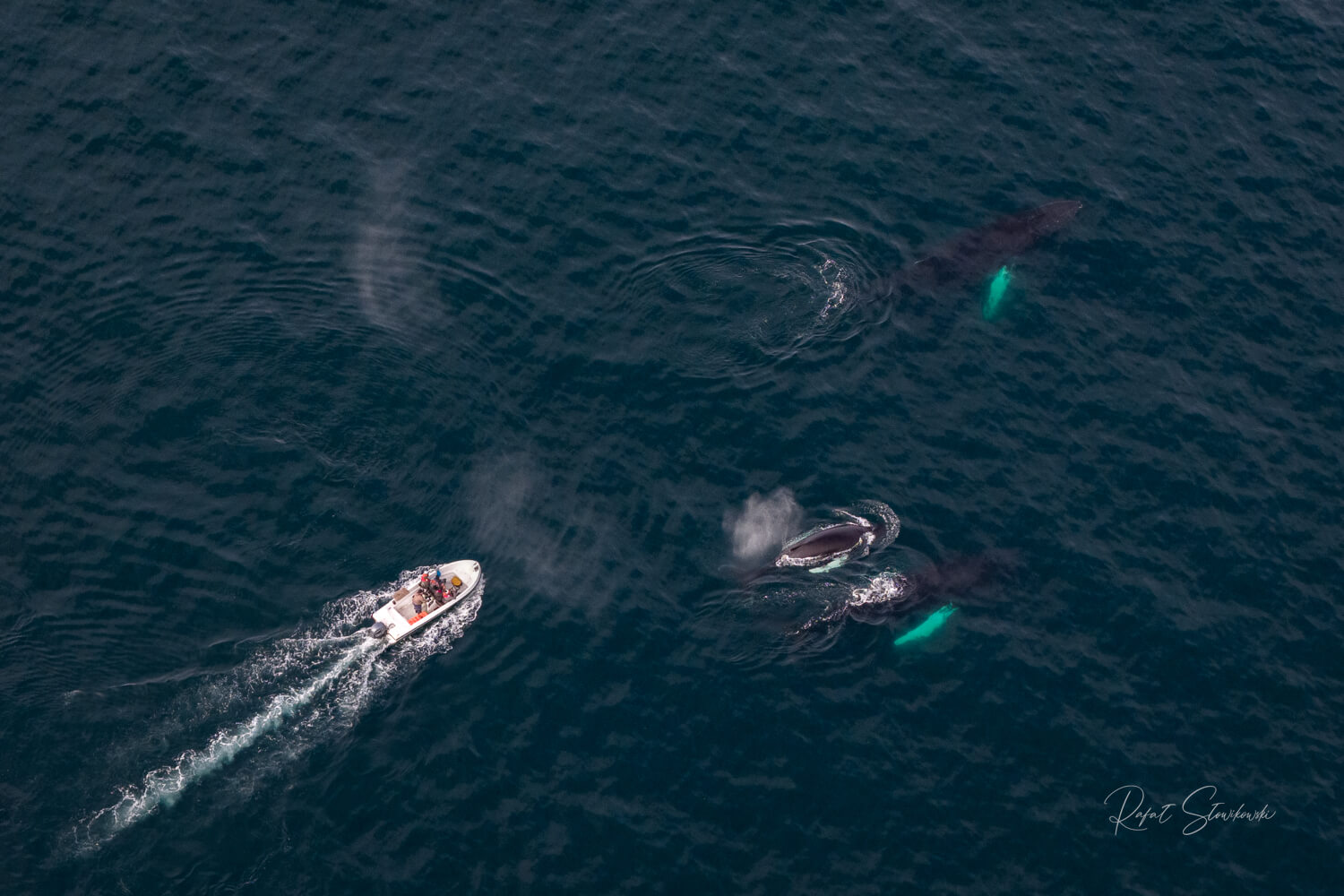 Nie bały się. Potrafiły nawet podpłynąć i z zaciekawieniem krążyć i się przyglądać naszej łódeczce. Zachowując się tam fundowały nam prawdziwe wzruszenie! Fantastycznie można było to obserwować okiem drona. Doświadczony przewodnik zapewniał, że jesteśmy bezpieczni o ile będziemy przemieszczać się wolno albo wcale. Wieloryby po prostu muszą cały czas wiedzieć gdzie jesteśmy. Jakbyśmy poruszali się szybko, je zaskakując to mogłyby nas wywrócić. Ponoć takie wypadki się na Grenlandii zdarzają i o czym się słyszy, w innych częściach świata też.