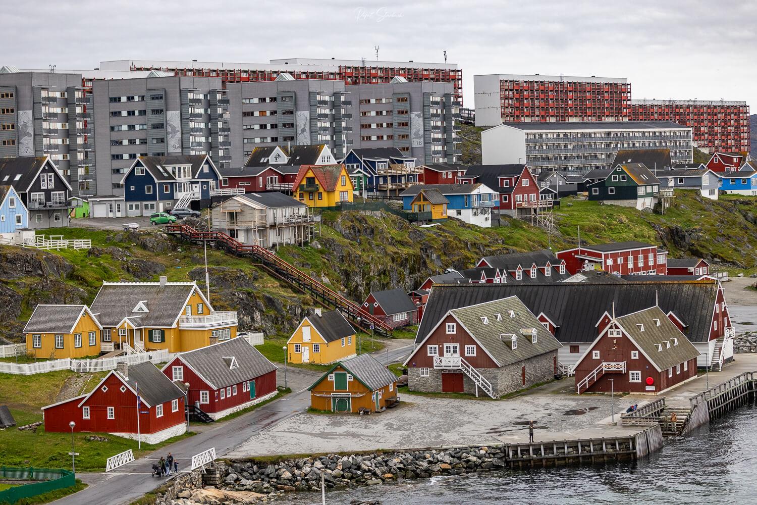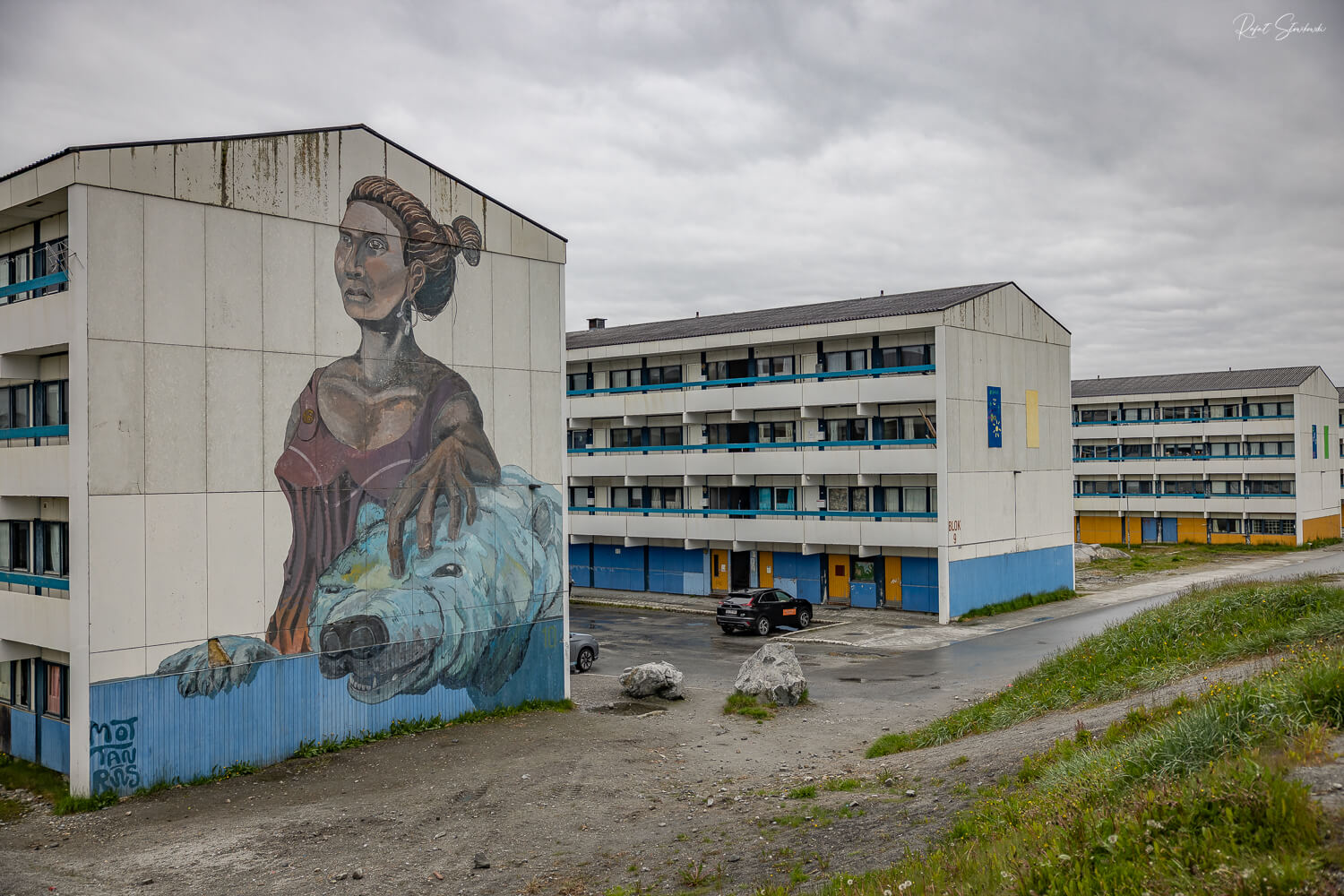 Bloki dalej od starego nabrzeża przypominały betonowe stwory mające zepchnąć kolorowe domeczki wkrótce do morza. Jak długo Grenlandia zachowa jeszcze swojego ducha? Nie mam pojęcia🤷🏻♂️
