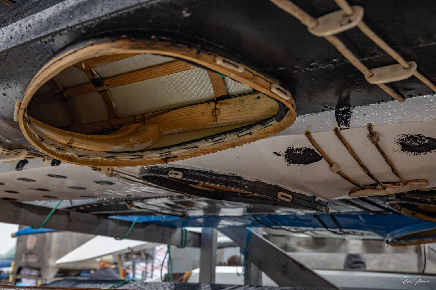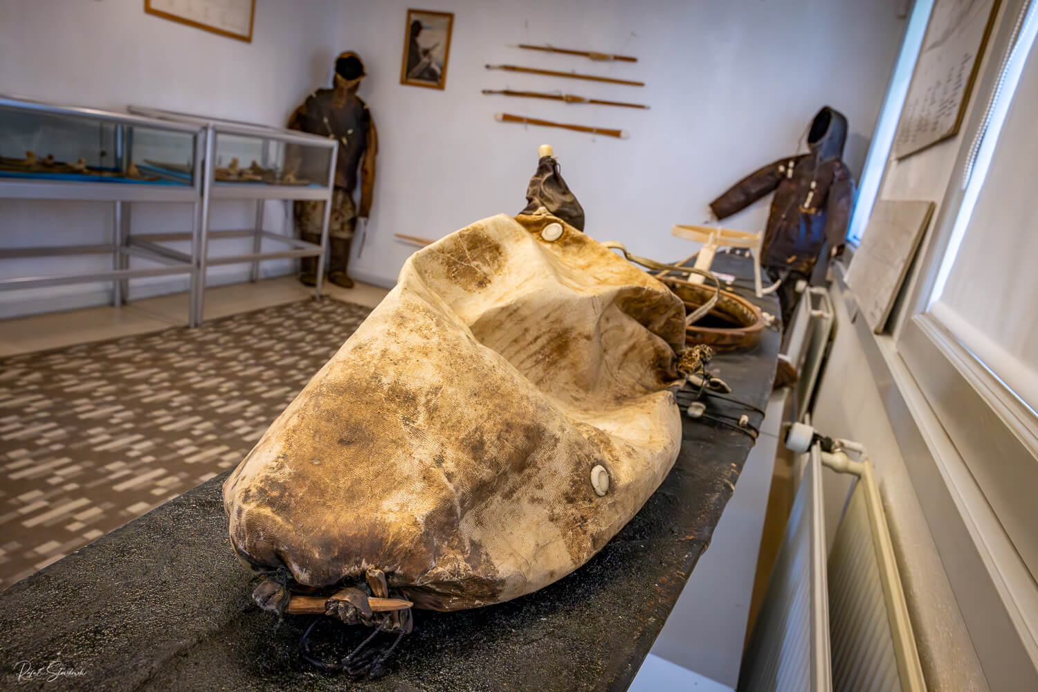 Ozdoby na tradycyjnym kajaku z foczej skóry na jednej z ekspozycji.