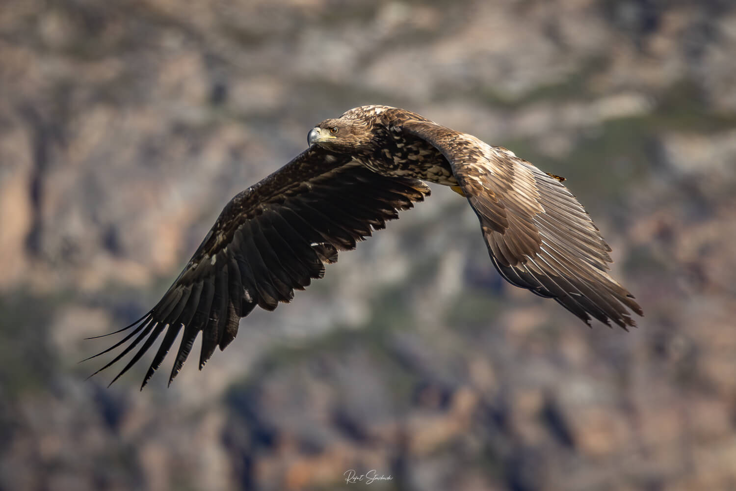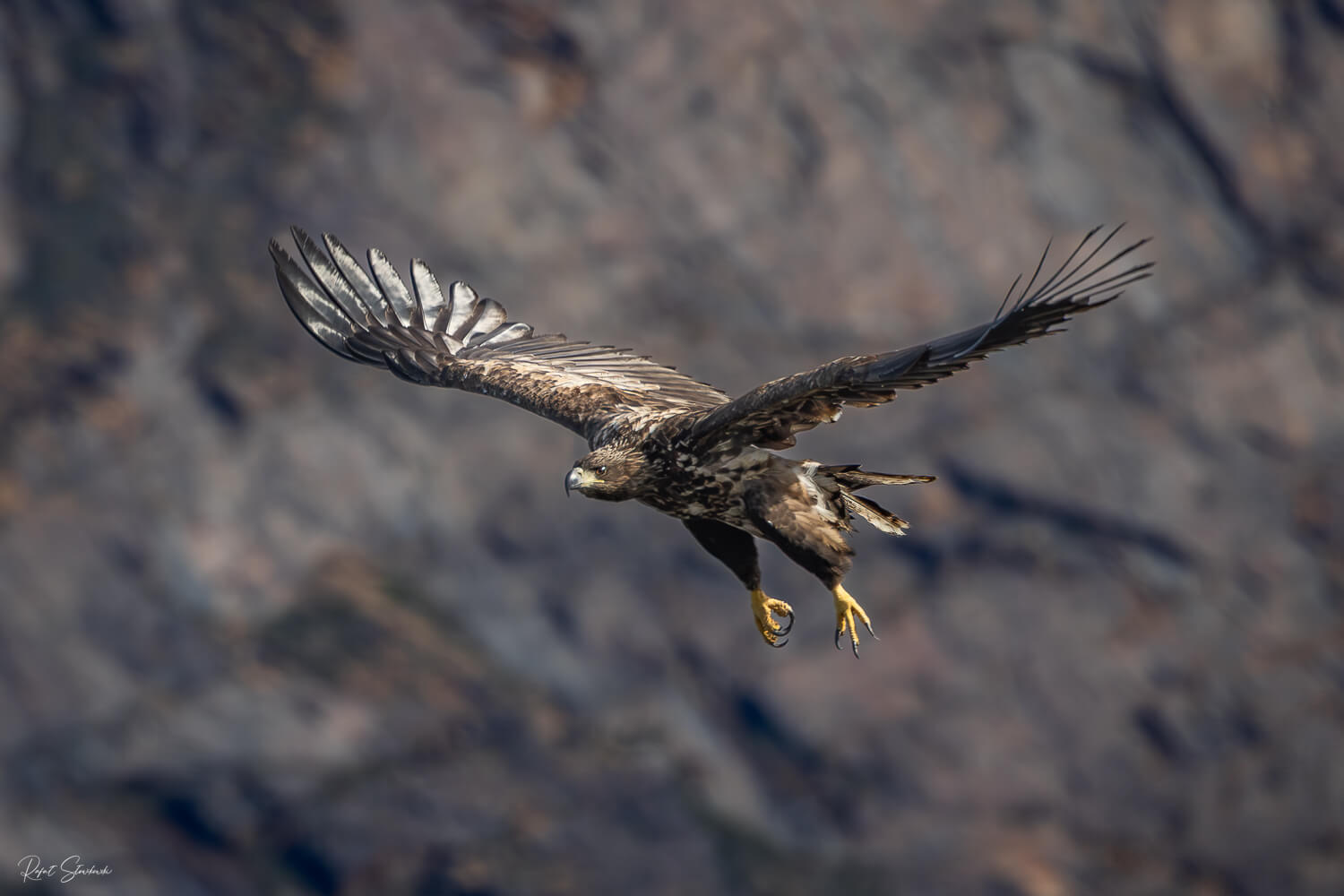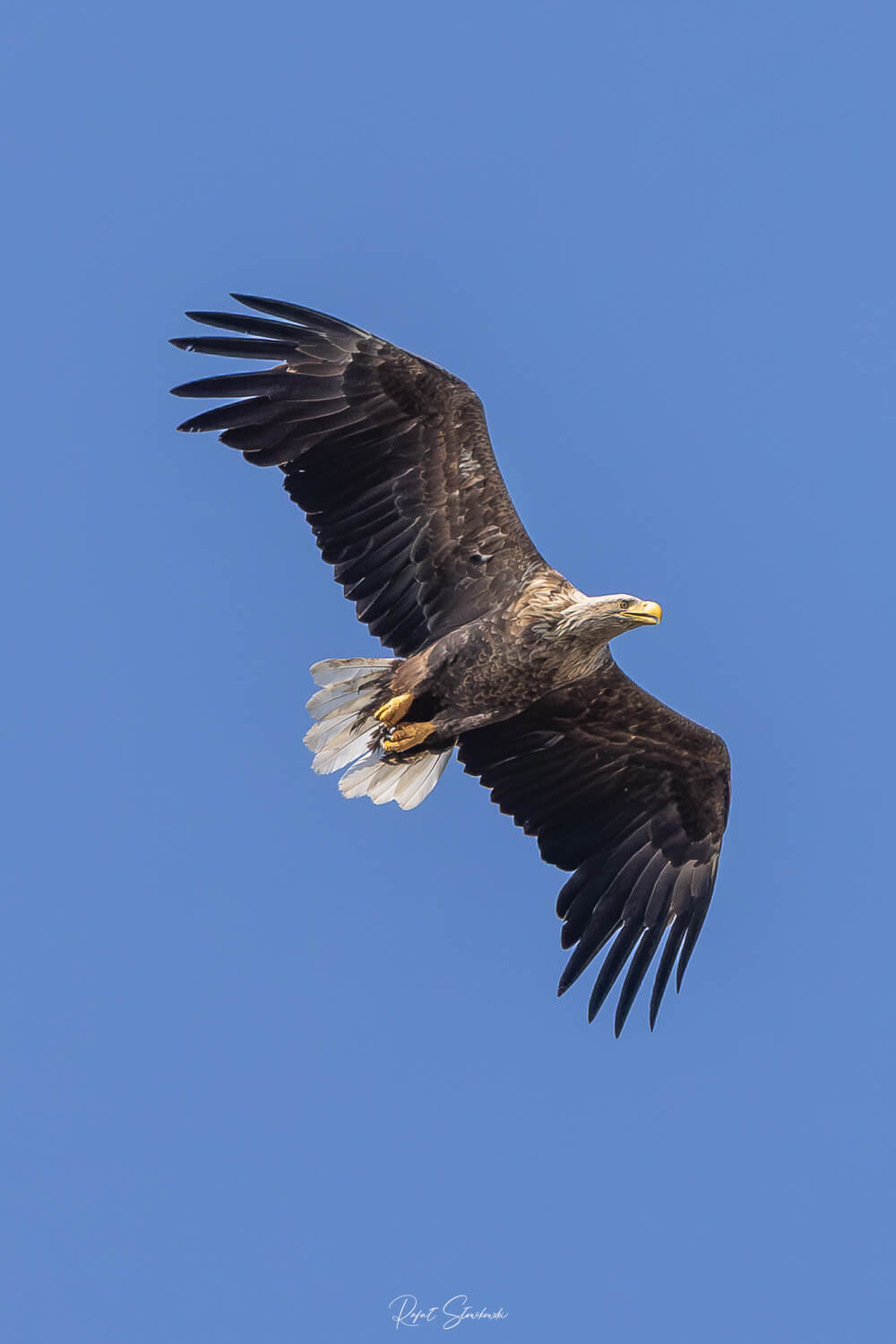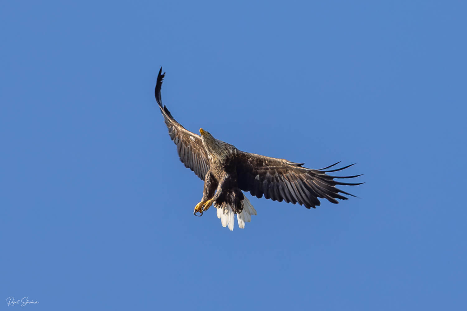 Tu bielik w całkowicie dorosłej szacie upierzenia. Spójrzcie na te szpony. To nimi łapie dorsze i palie!