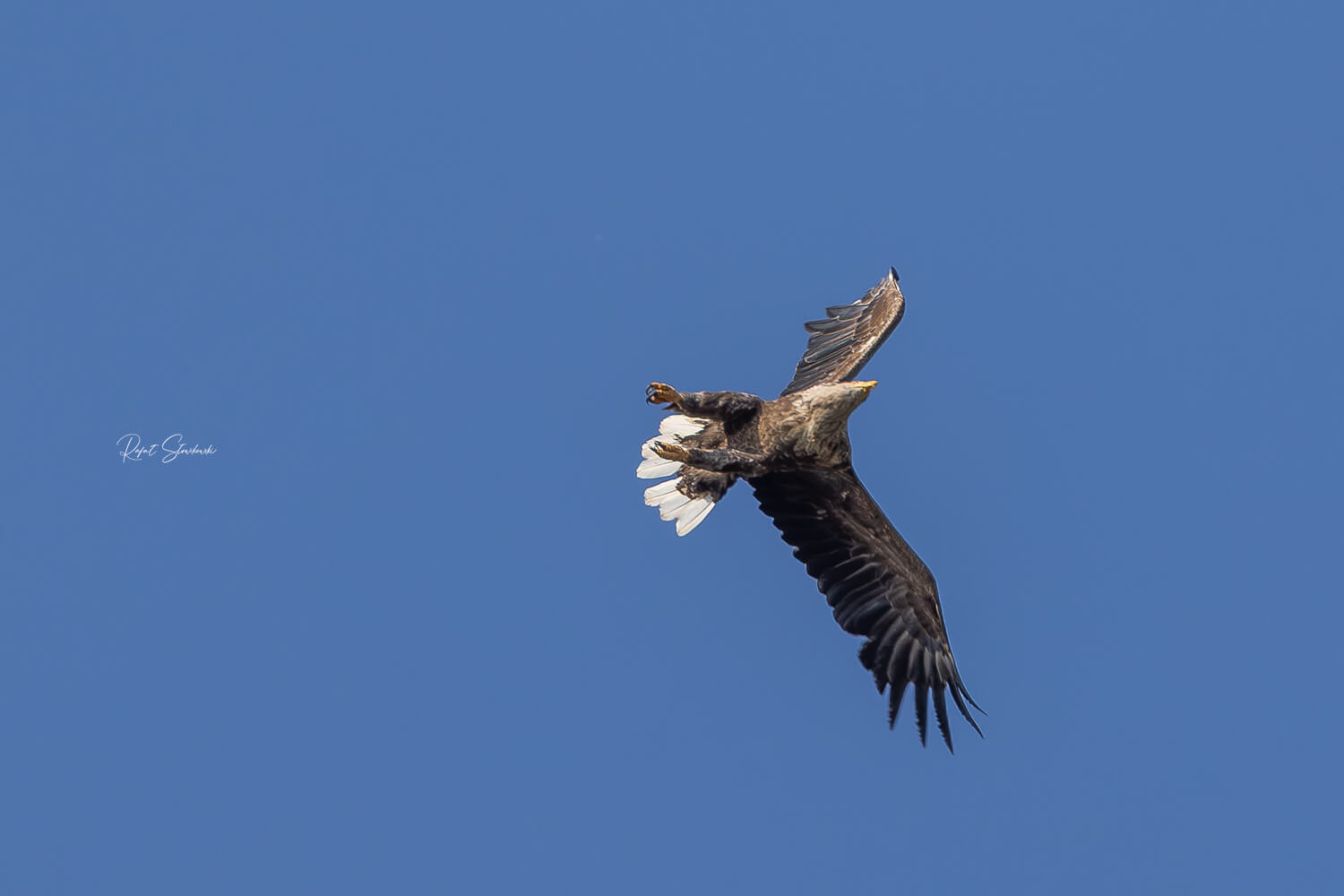 Pobawił się nieco w akrobacje i poleciał. Codziennie przynosiliśmy do obozu znalezione lotki i sterówki dorosłych bielików. Kto wie – może znaleziona biała sterówka w zbiorze u Dawida pochodzi od tegoż właśnie osobnika!