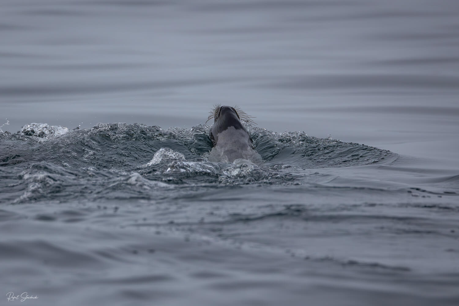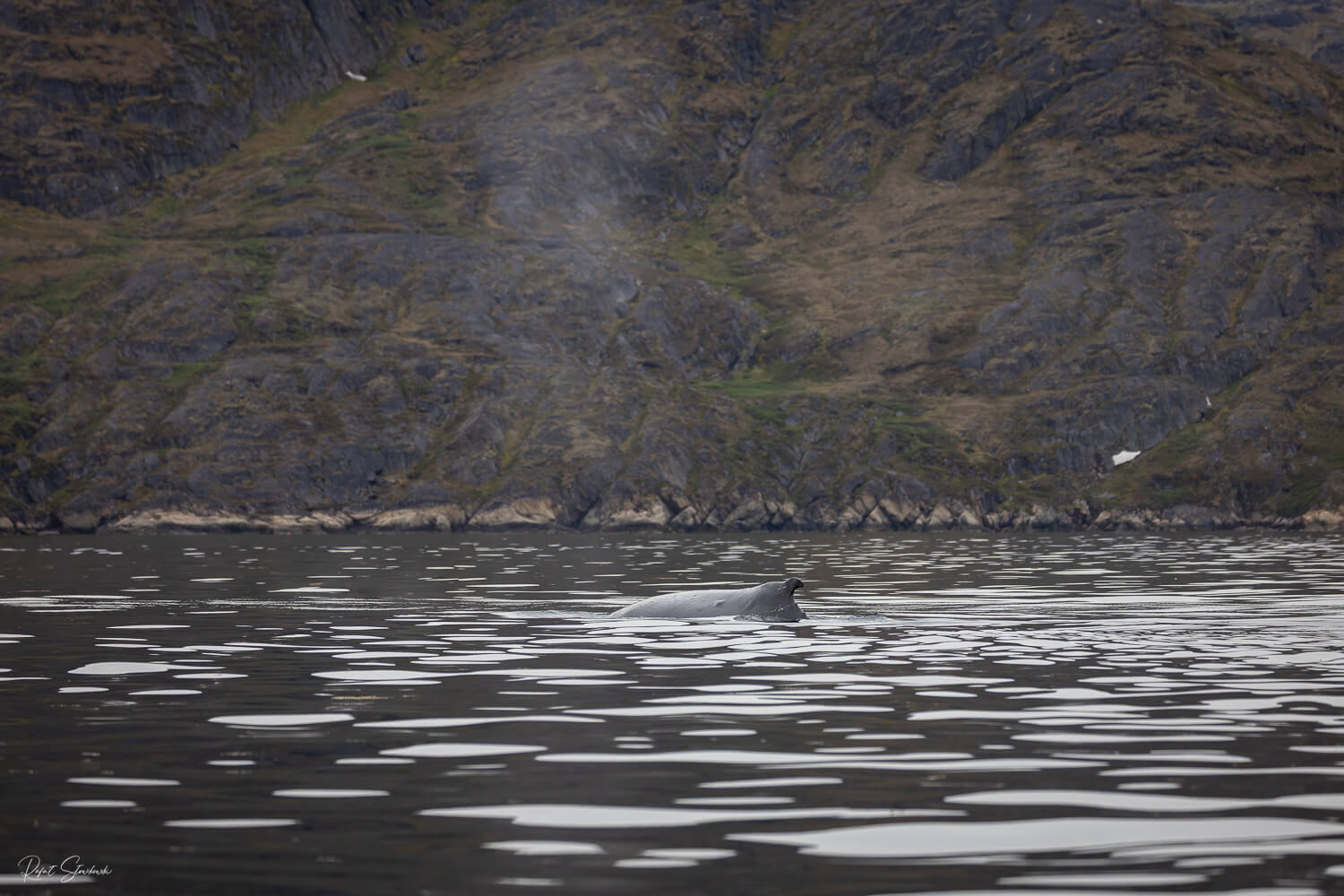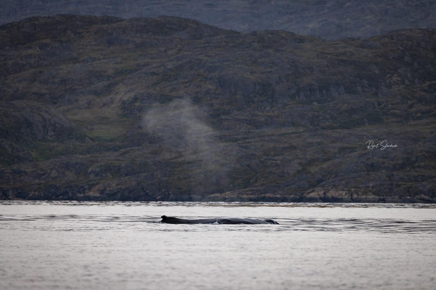 Po dwóch godzinach pływania, zmarznięci na kość w końcu najpierw usłyszeliśmy, potem zobaczyliśmy finwala (Balaenoptera physalus).