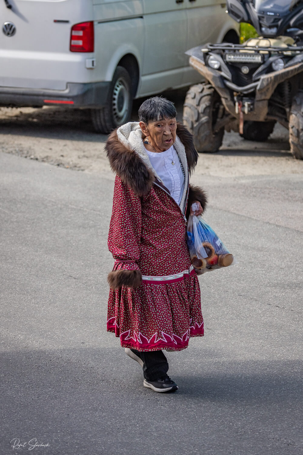Rzadki widok Grenlandki w tradycyjnym innuickim stroju. Kobitka minutę później po zrobieniu tego zdjęcia wsiadła w taxi i pojechała.