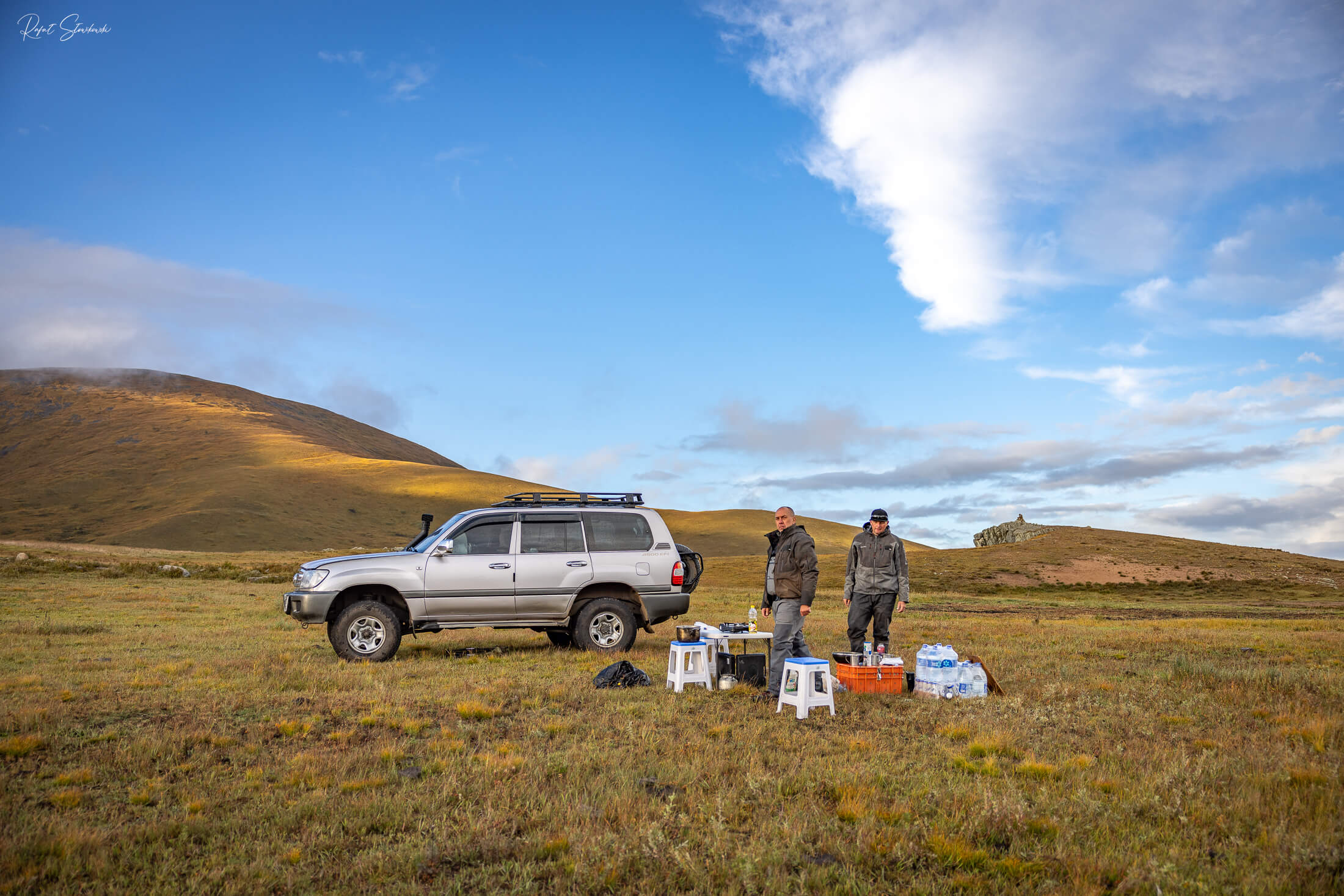 Z uwagi na deszcz, smażenie odbyło się już pod samochodem a suszenie w namiocie. Niestety podróżując z wędką po Mongolii trzeba się narazić na takie niewygody. Do tego zimne noce w sierpniu i bezsenność związana z wysokością (ponad 2000m n.p.m.). Czyli to co tygrysy lubią najbardziej!🤓