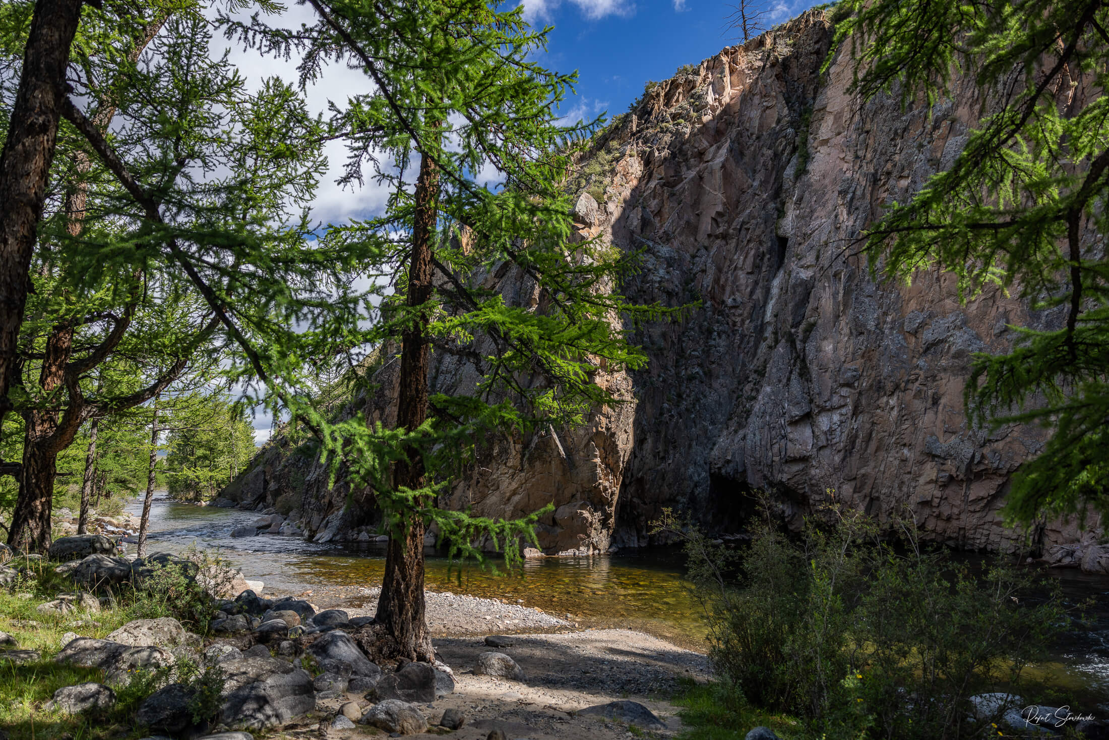 Larix sibirica czyli modrzew syberyjski to najczęściej spotykane drzewo w górach Changaju, przez które płynie rzeka pełna płetwiastych klejnotów.