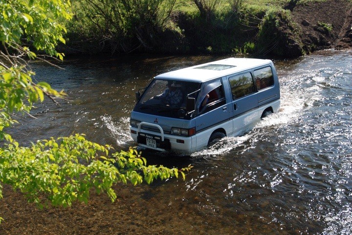 Poruszaliśmy się dość wygodnymi, klimatyzowanymi japońskimi maszynami. Logo „Bayan-goł” promujące nasz klub w stepie szerokim.