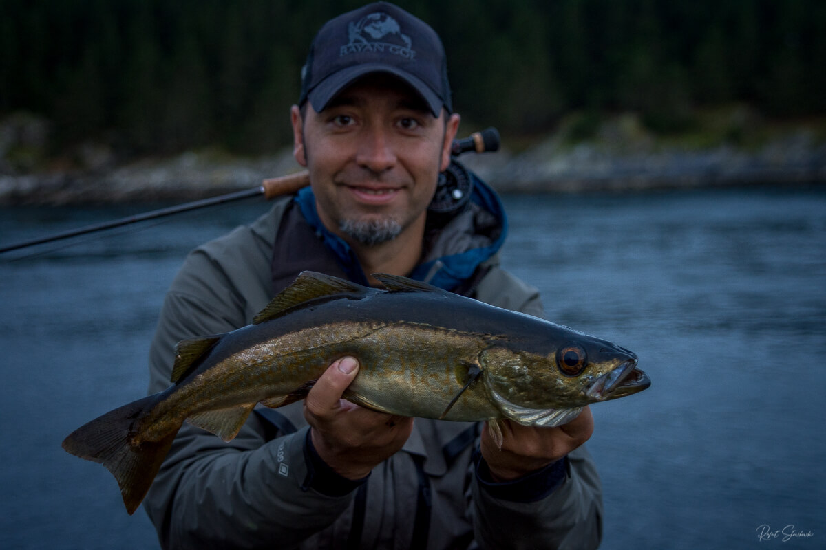 Rafał ma bankowe miejsce z brzegu na muchę na rdzawce (z norweskiego „lyr”). Żyją sobie przy jednej z tylko Rafałowi znanych wysp, pod pionową ścianą i jest ich tam w cholerę! Przynajmniej podczas naszego tam pobytu nie były wcale proste do złowienia. Głównie odprowadzały i wąchały… Gdy jednak założy się muchę od Arka i Agnieszki Kubale http://tuhola.net branie to jest kwestią czasu.