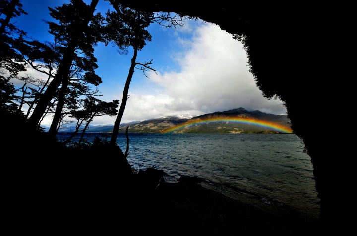 Spojrzenie na Lago Fagnano – jezioro na pograniczu chilijsko-argentyńskim. Dł. Ok. 100km, max gł. Ok. 200m! Tu przy cyplu „śpiewających kamieni” – plażę na nim pokrywały same bardzo płaskie i lekkie kamienie (idealne do robienia „kaczek” – rekord z pewnością ponad 20!). Fale uderzające o brzeg je podnosiły a gdy odpływały kamienie opadały ze stukotem. Śpiewała tak cała plaża. Fantastyczny efekt!