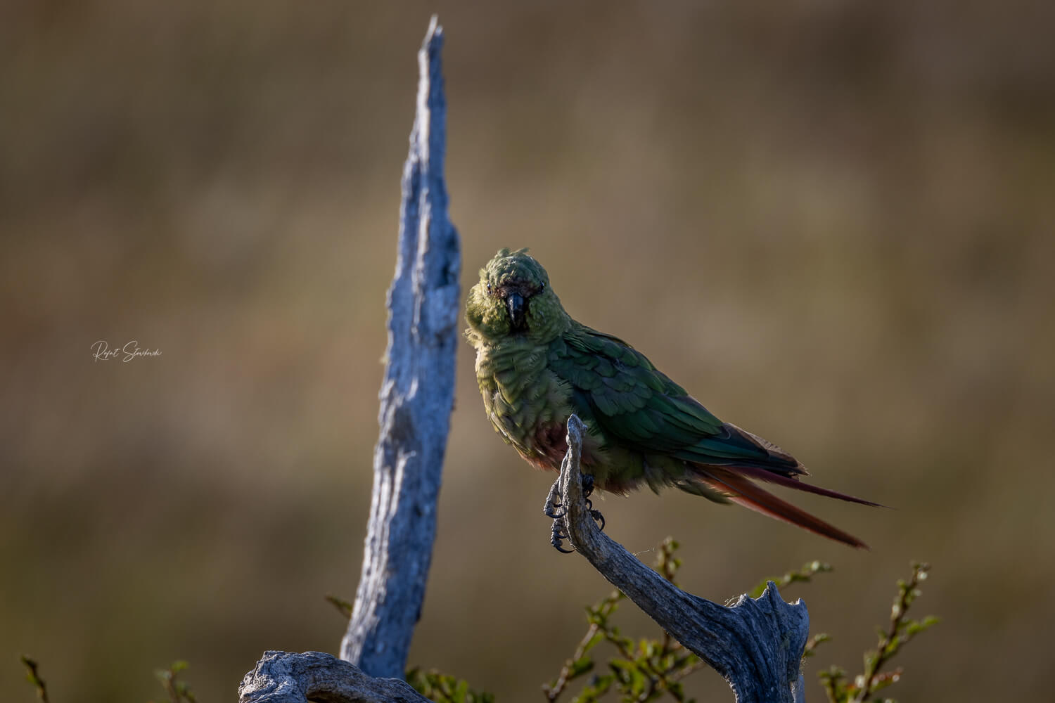 Hałasujące przy domku papużki to rudosterki patagońskie, in. krótkodziobe (Enicognathus ferrugineus), które vis a vis domku przylatują do wysięku w skarpie, który jest ich ulubionym poidełkiem.